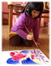 藝術的創作是自己內在經驗的表達,讓孩子有純色彩經驗的水彩畫,運用三原色透過畫紙與水的交互作用,色彩所產生的重疊色彩或色彩的波流給予孩子完整色彩經驗,使感官和四肢更加敏感,有助於往後藝術創作注入新生命。